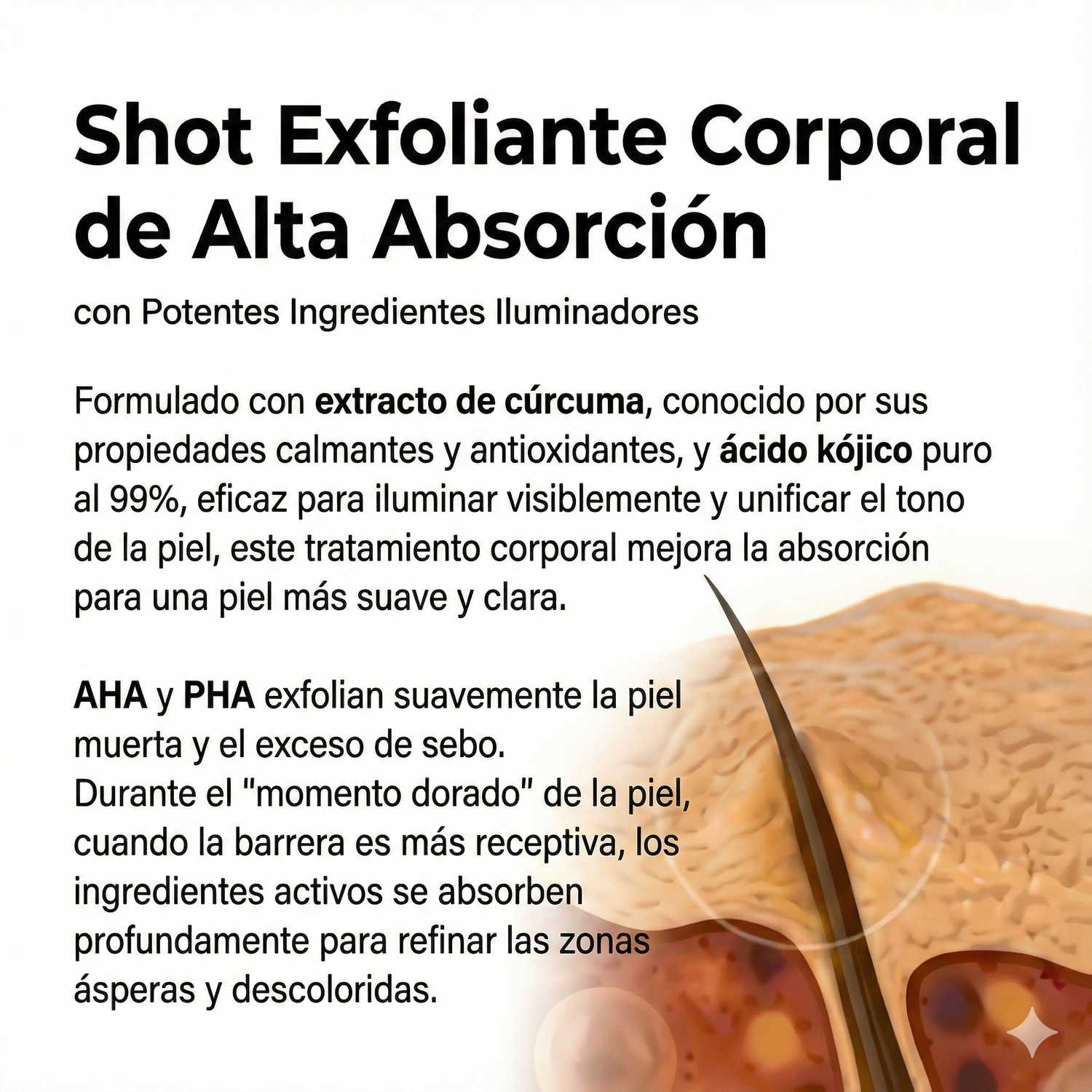 Transforma tu piel en segundos con el poder natural del Dr. Melaxin Peel Shot con Ácido Kójico y la Cúrcuma. Este spray disuelve instantáneamente la piel muerta y las impurezas profundas, aclarando visiblemente zonas oscuras como codos, rodillas y axilas. Elimina la textura y revela una piel suave, uniforme y radiante desde la primera aplicación, sin irritación.